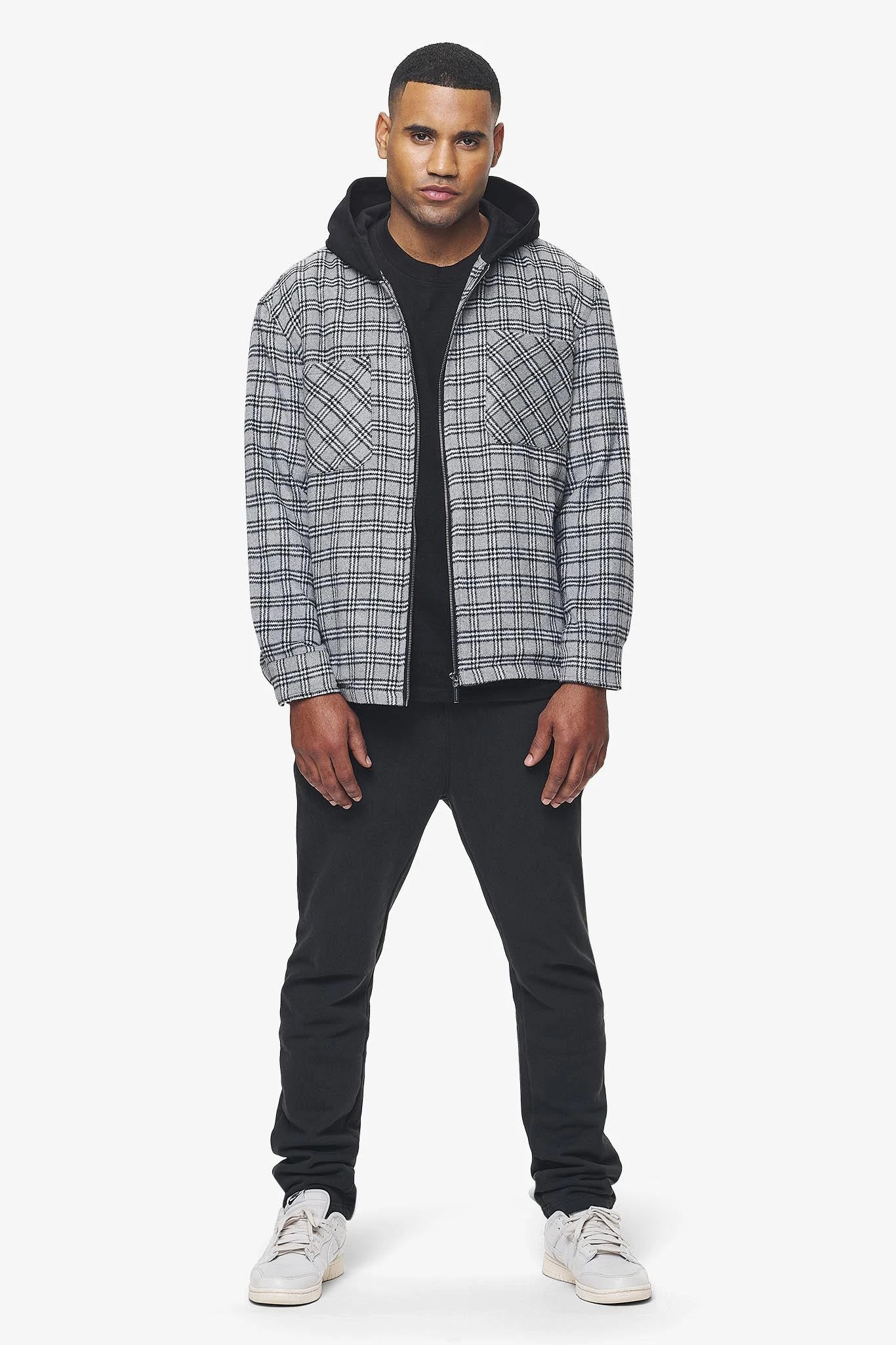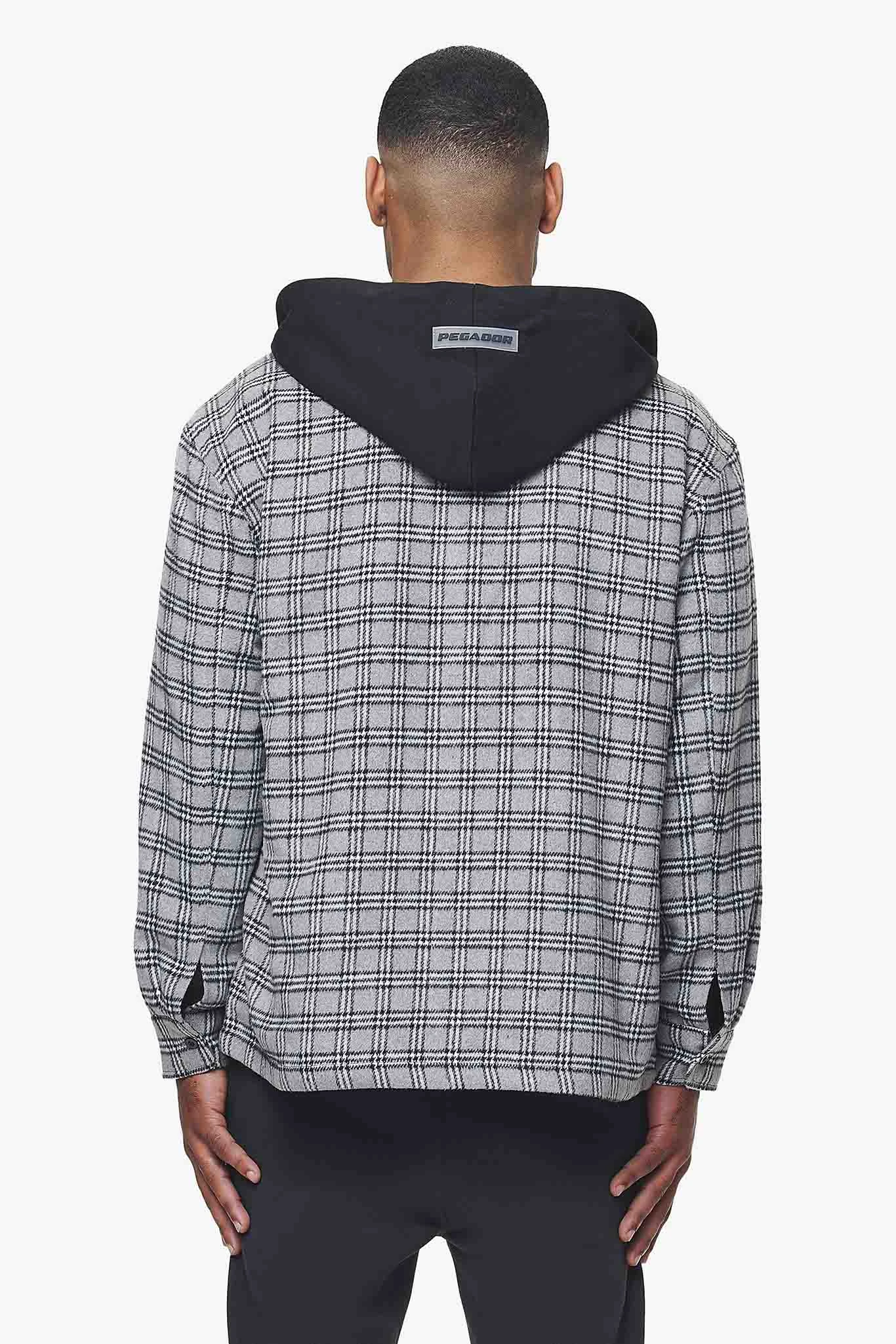 - grey/black hooded hairy flannel shirt