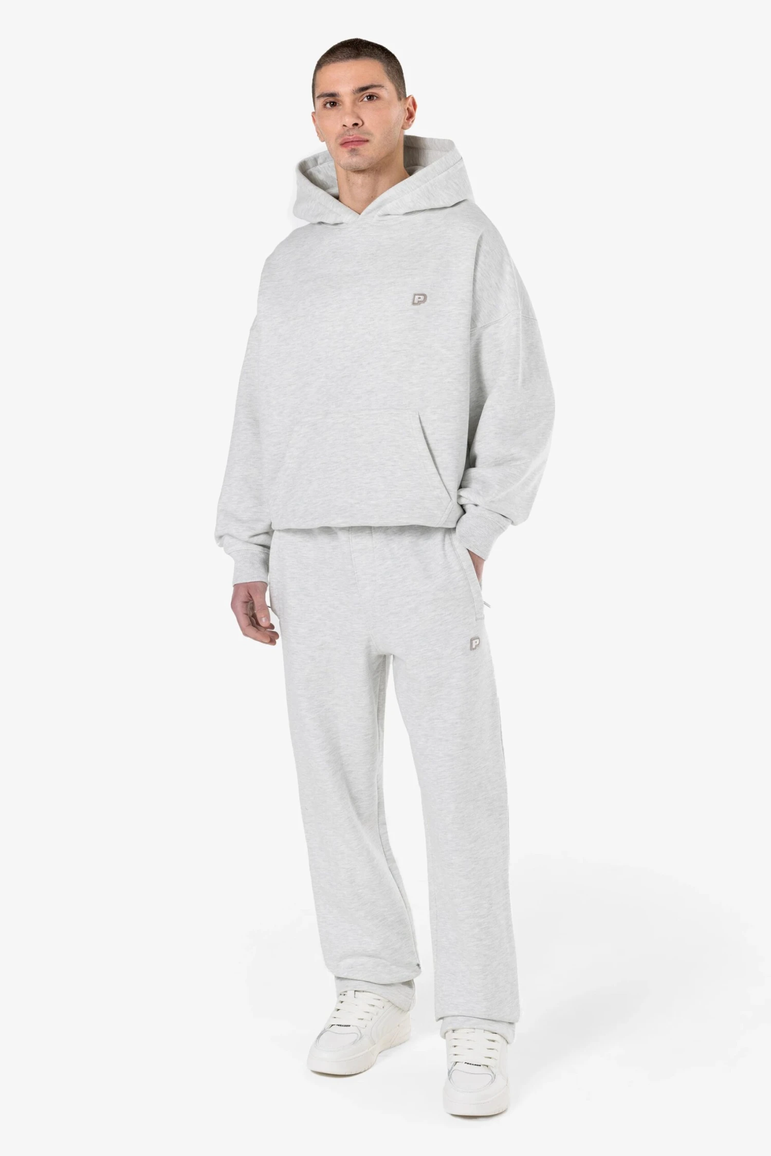 - weißer/dark stone-farbiger Logo-Patch auf dem linken Bein
